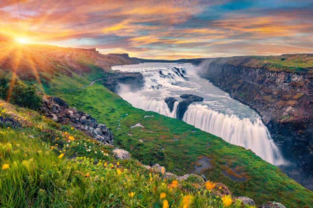 Thác nước Gullfoss (nghĩa: Golden Falls) hùng vĩ, một trong những thác nước đẹp và đặc biệt nhất Iceland. Thác nước hình thành do địa hình đứt gãy ở vùng hạ lưu của con sông Hvita miền Đông Nam Iceland, tạo thành 2 bậc thác với chiều cao 32m. Đến với Gullfoss mọi thời điểm trong năm, Quý khách đều trầm trồ trước sự kỳ vĩ và không ngớt lời khen ngợi cho thiên nhiên của Iceland.