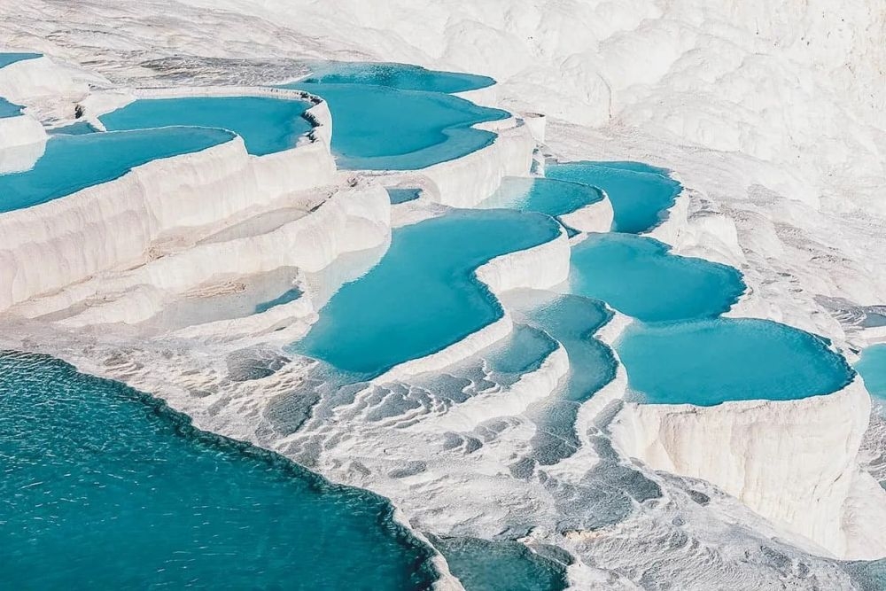 Tiếp tục đến với Pamukkale (~400km, ~5 giờ di chuyển) –điểm đến hấp dẫn nhất nhì Thổ Nhĩ Kỳ bởi vẻ đẹp khó tin siêu thực. Nếu chỉ nhìn trên ảnh hay những thước phim từ trên c ao, người ta dễ nhầm lẫn đây là một núi tuyết khổng lồ nhưng thật ra đó chính là một vùng núi đá vô canxi cacbonic được tích tụ hàng nghìn năm với hình dáng như những hồ nước xếp thành từng tầng được tạo thành bởi quá trình biến đổi. Nước trong những “hồ bông” này là nước khoáng tự nhiên được hình thành từ mạch khoáng ngầm với màu xanh da trời và chứa nhiều khoáng chất có lợi cho sức khỏe và có thể hỗ trợ chữa bệnh. Ở Pamukkale có đến 17 suối nước nóng với nhiệt độ từ 35 – 100 độ phục vụ du khách.