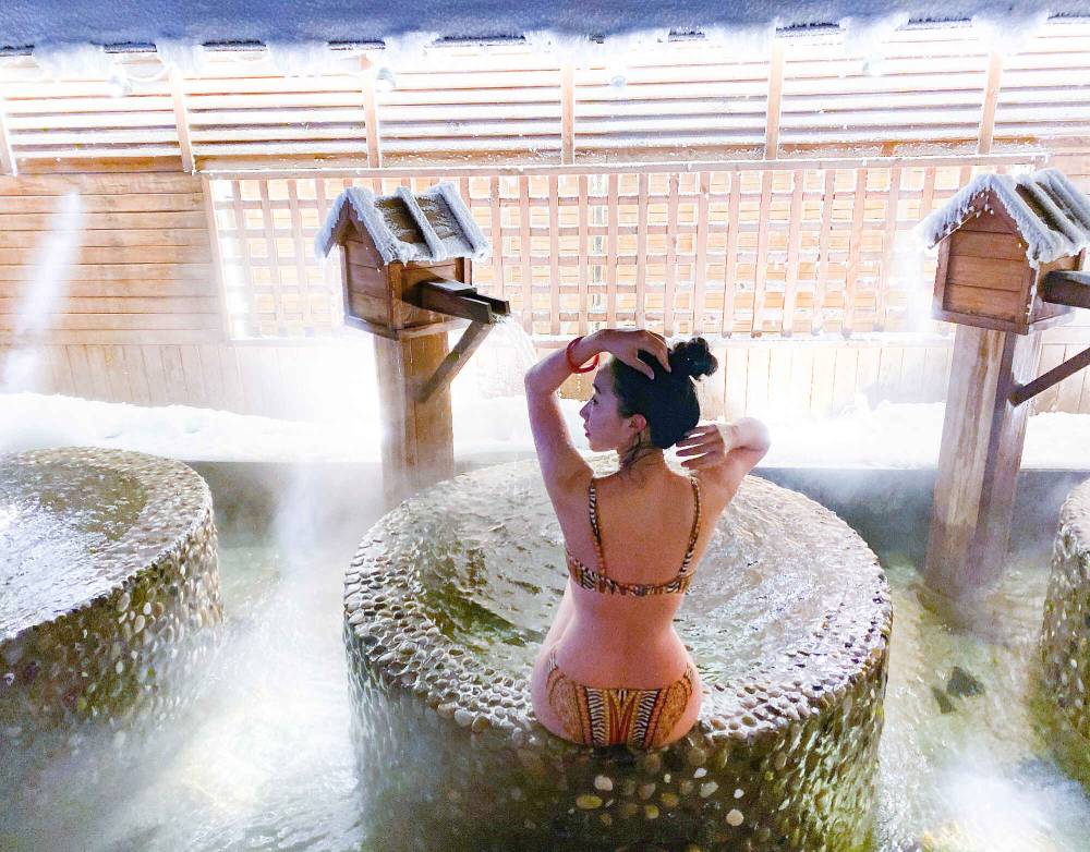 Mặc một bộ bikini rực rỡ chạy lon ton trên tuyết, tắm Onsen ngoài trời -30 độ C.