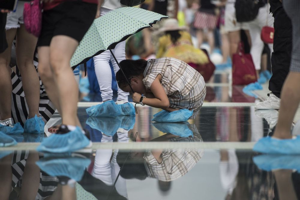 Một bé gái đang nhìn xuống cảnh vật bên dưới thông qua sàn cầu kính trong suốt