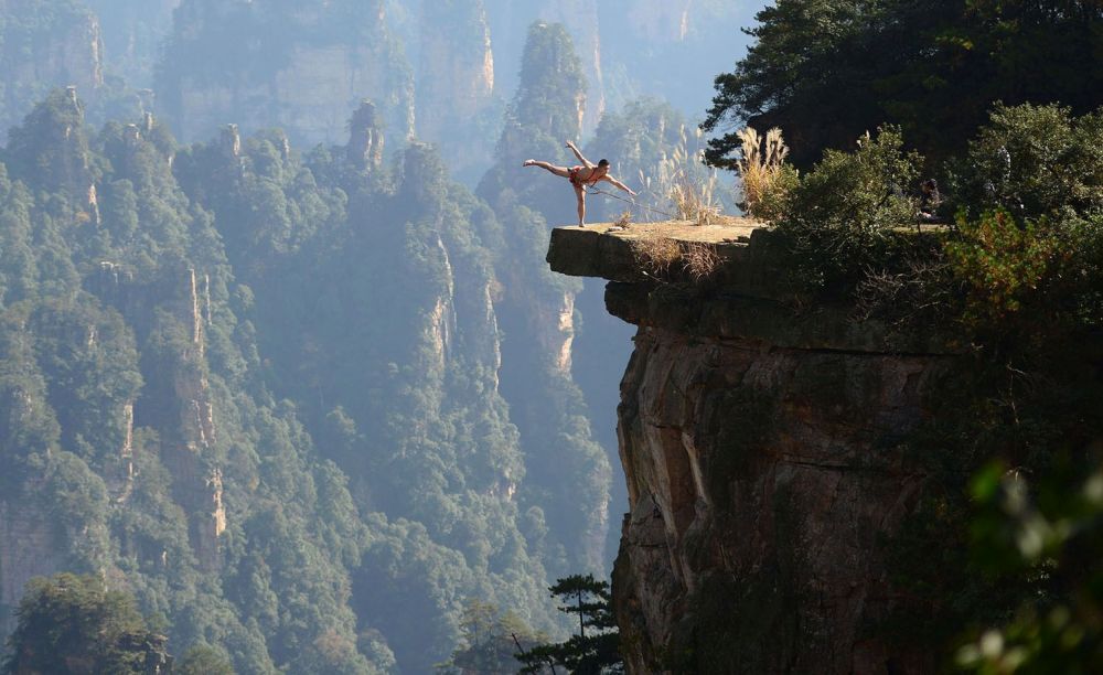 Người đàn ông mạo hiểm thực hiện một động tác biểu diễn ngay mép sườn vách núi cao ở Trương Gia Giới