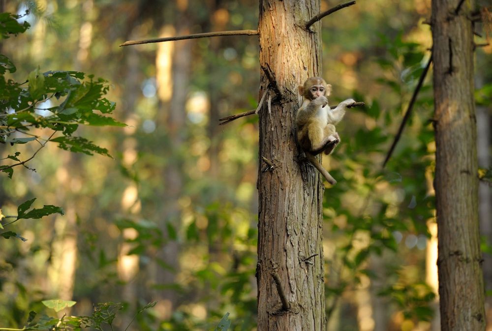 Một chú khỉ con ngồi trên nhánh cây ở công viên rừng quốc gia Trương Gia Giới