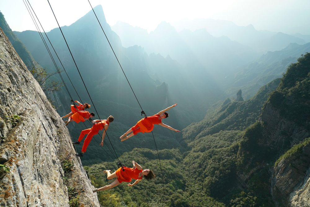 Các vũ công từ đoàn múa nghệ thuật Bandaloop của Mỹ trang bị dây bảo hộ khi thực hiện các động tác biểu diễn bên sườn vách núi ở Trương Gia Giới