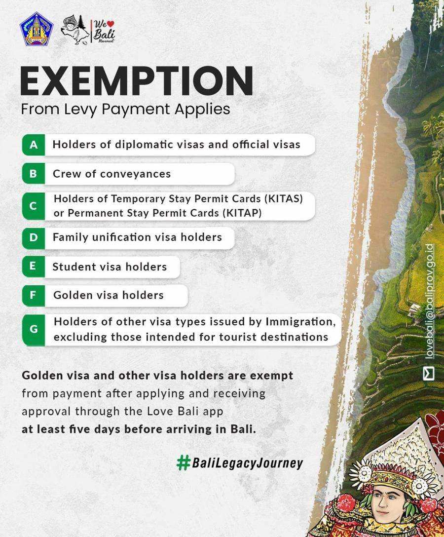 Thuế sẽ áp dụng đối với khách du lịch người nước ngoài đến Bali. Một số trường hợp được miễn thuế như: người mang hộ chiếu ngoại giao, hộ chiếu công vụ; phi hành đoàn, thủy thủ đoàn; người được cấp thẻ tạm trú ở Indonesia (KITAS) hoặc thẻ thường trú ở Indonesia (KITAP); người có thị thực theo diện đoàn tụ gia đình, thị thực vàng hoặc thị thực du học; và những người được cấp các loại thị thực khác ngoài mục đích du lịch