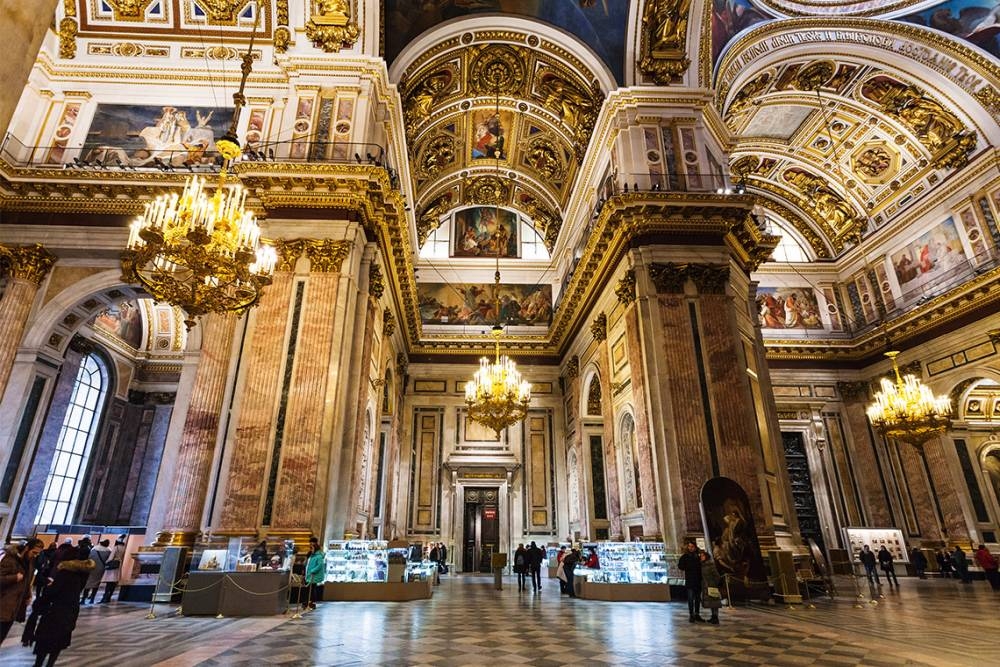 Nhà thờ Issac (bên trong): kỳ quan kiến trúc của đế chế Nga hoàng, một trong những biểu tượng của thành phố St Petersburg. Phía ngoài nhà thờ được trang trí bởi 112 cột đá hoa cương, chiều cao mỗi cột lên tới 15m, khối lượng từ 64-114 tấn